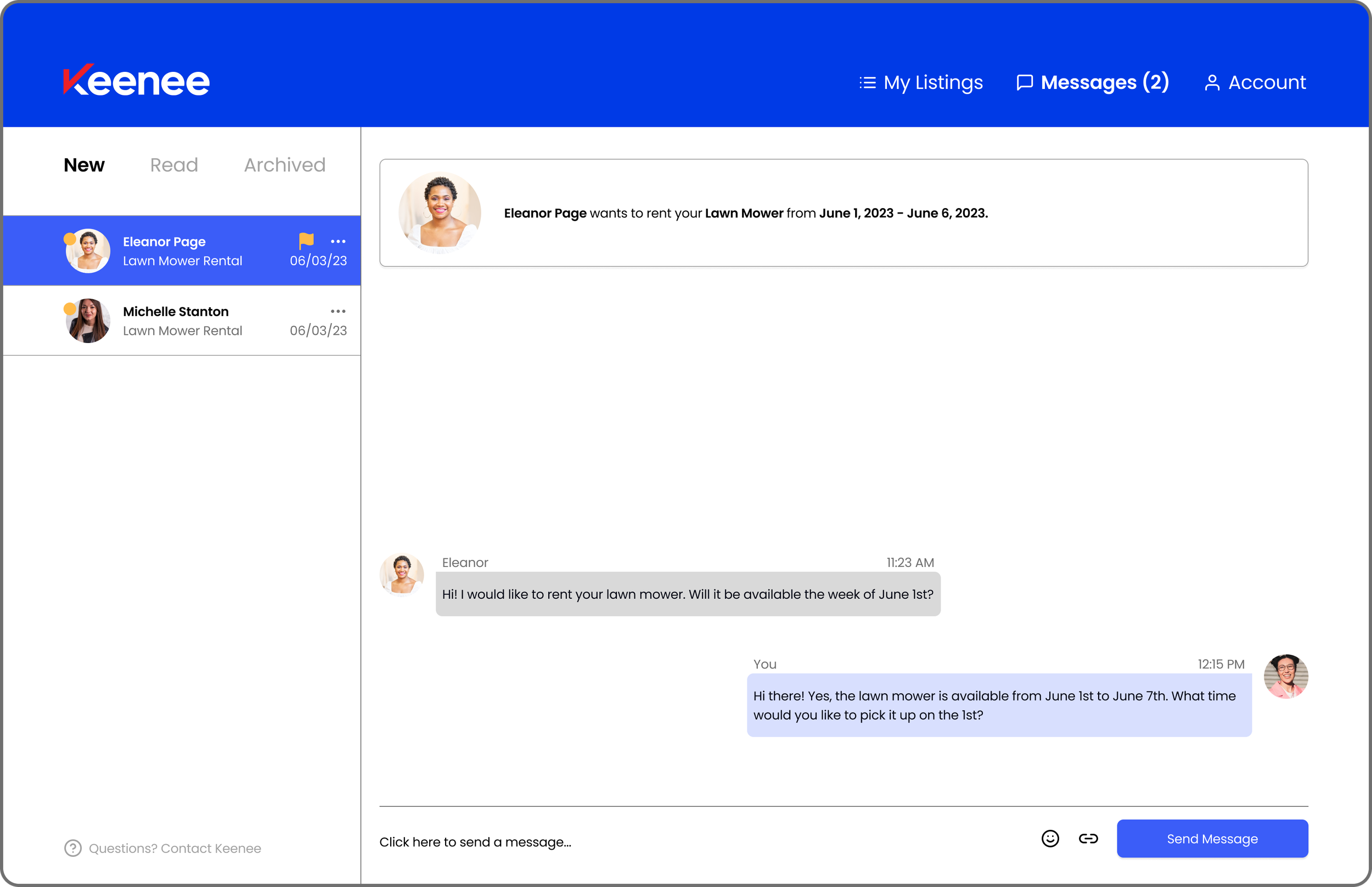 The messaging feature in the app is fantastic. It allows me to ask questions or clarify details with the renter before I commit to renting an item. Definitely has the potential to avoid headaches and feel more confident in my transactions. 5 stars all the way!